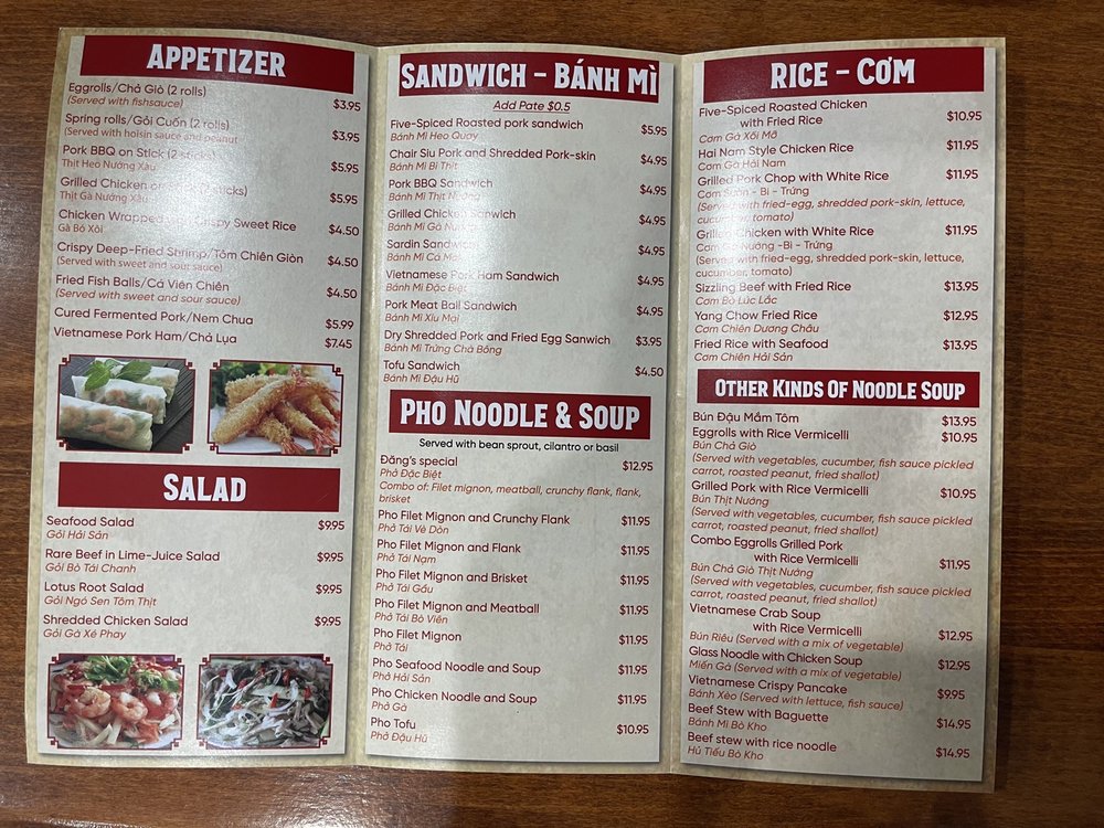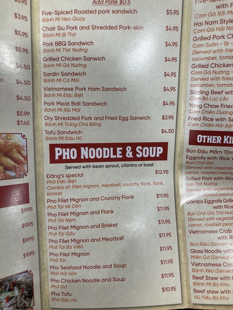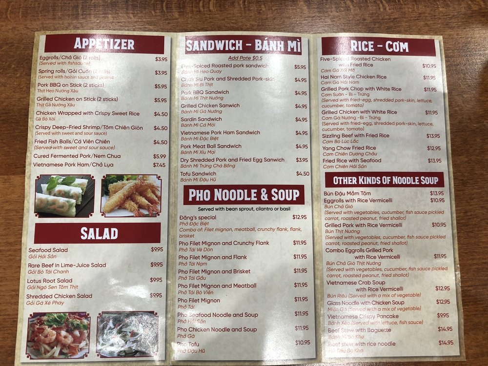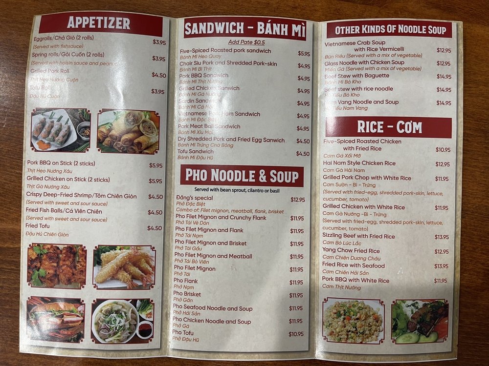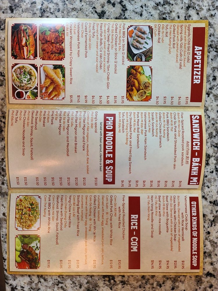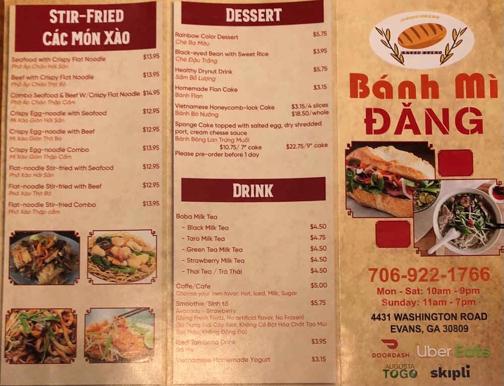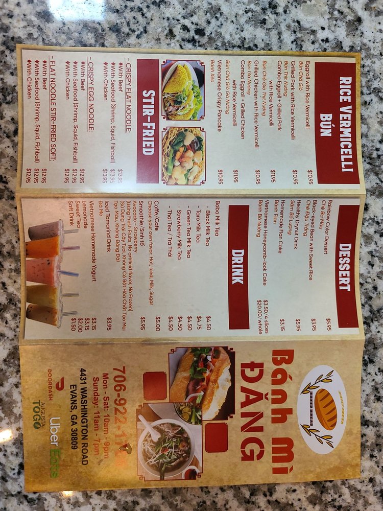 Introducing the menu at Bánh mì Đăng, a Vietnamese restaurant in Evans, GA, known for its exceptional selection of soups and sandwiches. With options for delivery, takeout, reservations, and vegan dishes, this casual spot is perfect for groups and dinner outings. Customers rave about the flavorful pho, banh mi sandwiches, pork vermicelli bowls, and unique offerings like Bun Rieu. The service is top-notch, with friendly staff eager to share their passion for Vietnamese cuisine. Standout dishes include the juicy pork BBQ sandwich, refreshing Thai tea, and the must-try honeycomb cake. Whether you're a first-timer or a regular, Bánh mì Đăng promises an authentic Vietnamese dining experience that keeps customers coming back for more.